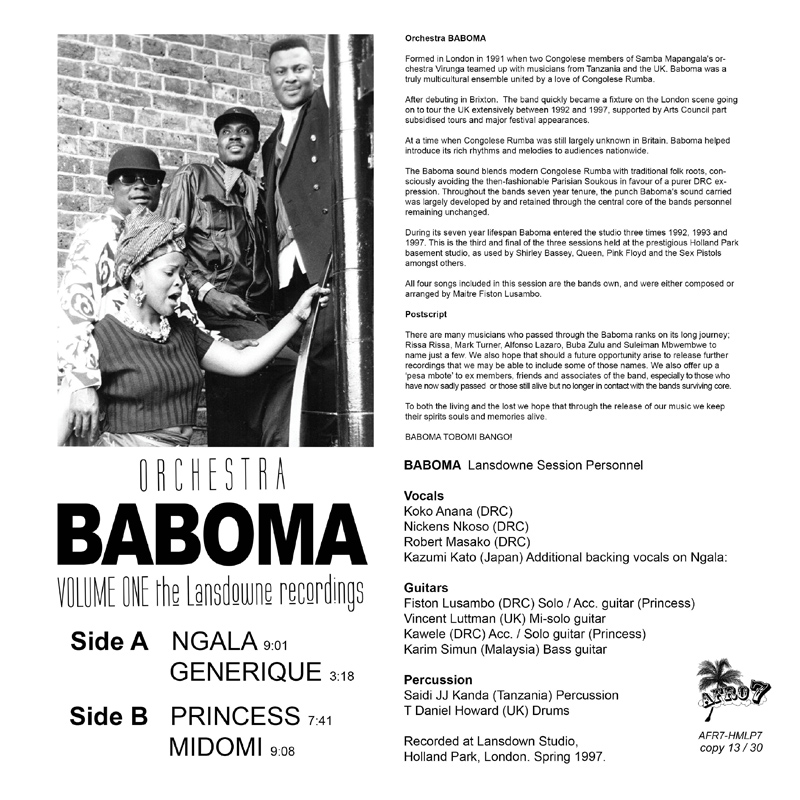 From our sister label AFRO7 comes this previously unreleased session, recorded at Lansdown Studio in London in 1997. It features four fantastic tracks in the Kinshasa Lingala style—guitar-driven dance music played to perfection. The band was very active touring in the 1990s England and included musicians from the Democratic Republic of the Congo, Tanzania, Zimbabwe, Malaysia, and the UK. All four songs on this release are original compositions by the band, either composed or arranged by the legendary Maitre Fiston Lusambo (who still produces music today). This marks the first release in a series of Baboma recordings from various UK studios.