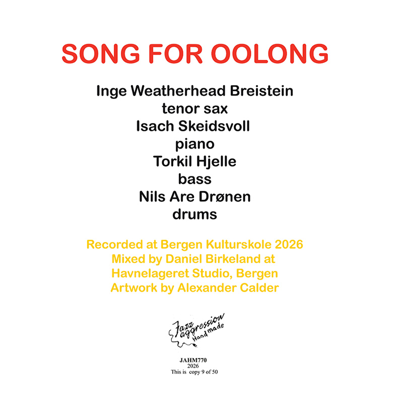 We’re very glad to present this unique free jazz recording, featuring top West Coast Norwegian talents: Inge Weatherhead Breistein on tenor sax, Isach Skeidsvoll on piano, Torkil Hjelle on bass, and Nils Are Drønen on drums. Recorded in Bergen, Norway, the set spans both sides of the album as a continuous free-form outing—at times aggressive, at times not so and opening into melodic, modal breathing room. With plenty of energy it’s exactly the kind of free jazz we appreciate at the label: not too far out, but rooted in the American free jazz scene of the 1970s—think Clifford Thornton or Julius Hemphill—with pulse and rhythm very much alive throughout.